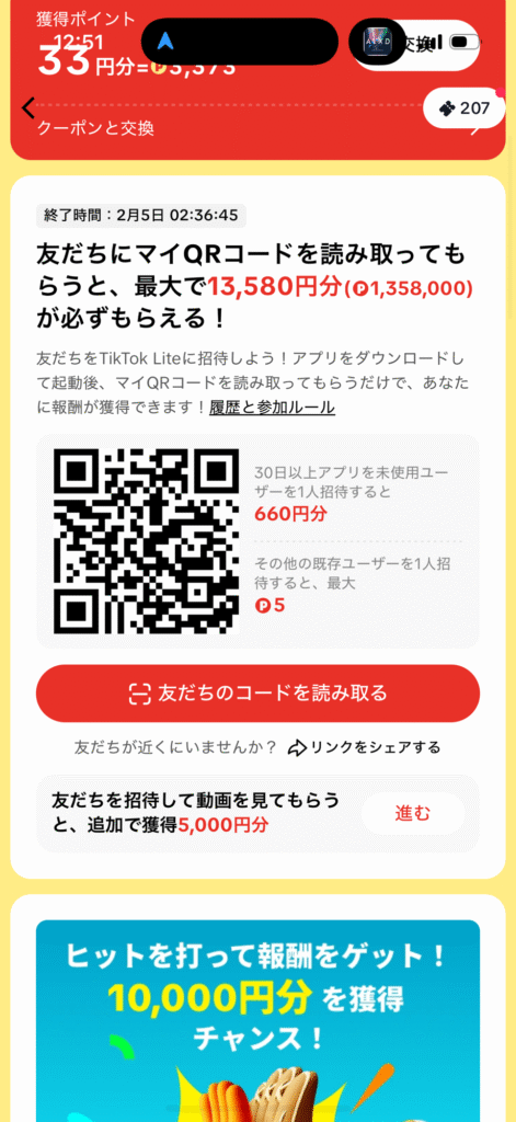 TikTok Liteを普通にインストールするだけではもったいないです!今なら、以下の招待リンクから登録して簡単なタスクを完了するだけで、数千円分のポイントがもらえます。